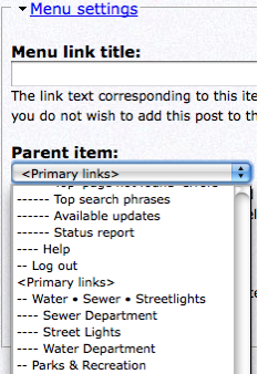 To add a menu item under a parent, select the parent menu item (two -) in the “Parent Item” dropdown (ex. The parent in this example would be “Water – Sewer – Streetlights” and “Sewer Department” would be a “nested” child.) More on this in the Menu section.