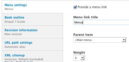 When editing your content scroll down to near the bottom of the page. You should see "menu settings" at the top of the menu in the lower left (left image). Clicking on "Provide a menu link" will cause a lot of options to appear such as menu link title, parent item, and weight. For basic menu editing these are the only three items we will worry about. |