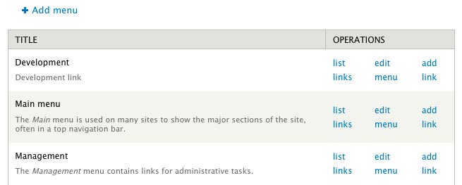Clicking on "list links" will give you a screen that looks like the image below. Each menu item has three options, enabled / edit / delete. Unchecking "enabled" will disable the menu item, but not delete it. The gray crosses next ot each menu item can be clicked and dragged to restructure the menu. Drag up and down, or pull them to the right underneath another menu item to create a sub-item. "Anatomy and Glossary of Type" is a sub-item of "Resources".