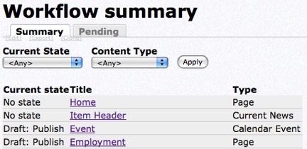 The admin menu of all content and their Workflow status can be found on the Admin menu under Workflow Summary