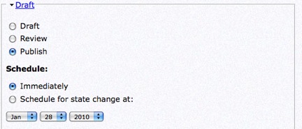 Admin users will be presented with the extra workflow options of “Publish” that other users will not be allowed to set. Changing the status to Publish will then name the content live to visitors. The status can also be scheduled to change on a certain day.